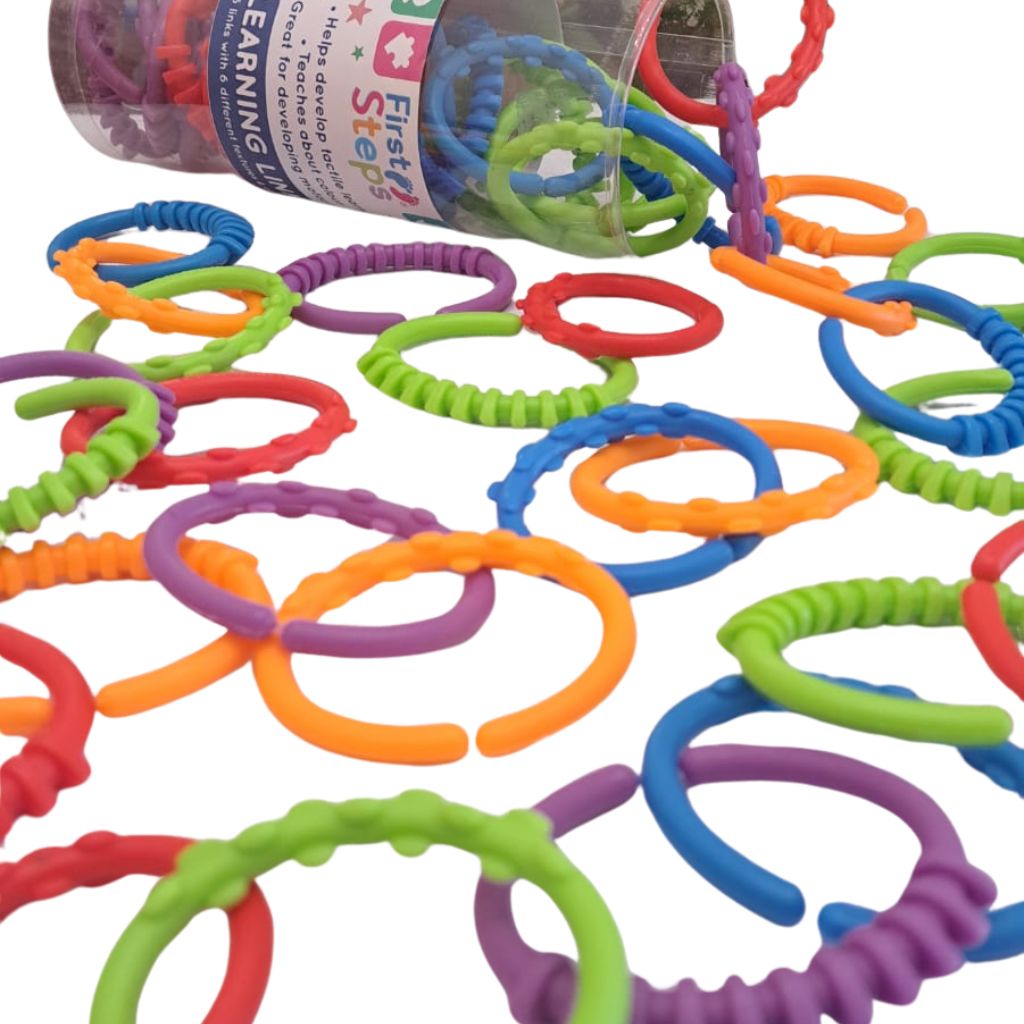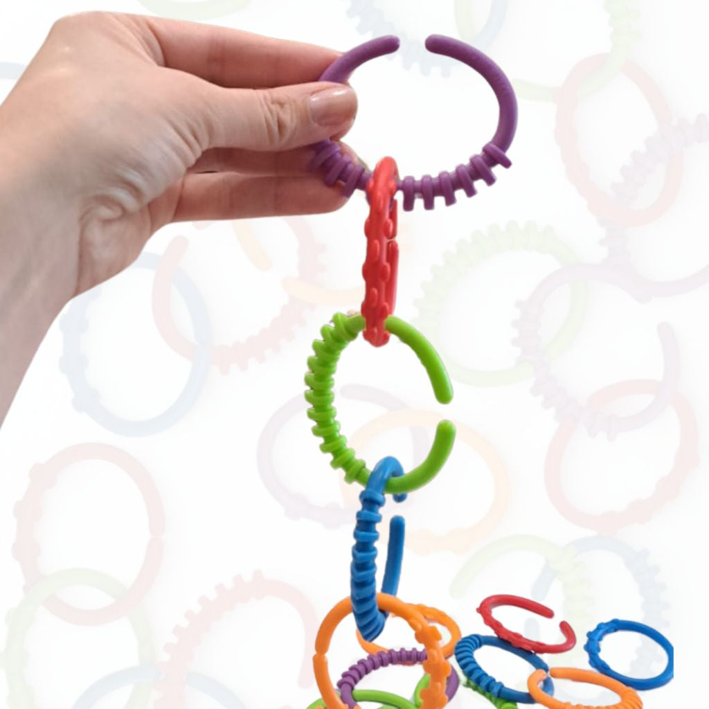 Los Aros Sensoriales Para Unir son perfectos para acompañar a los más pequeños en sus primeras exploraciones. Con texturas suaves, colores llamativos y un tamaño ideal para manos pequeñas, estos aros permiten encadenar, construir, experimentar y jugar libremente. Favorecen el descubrimiento sensorial y la coordinación mientras niñas y niños unen, separan y crean cadenas infinitas. Ideales para bebés y preescolares que están descubriendo el mundo a través del tacto.