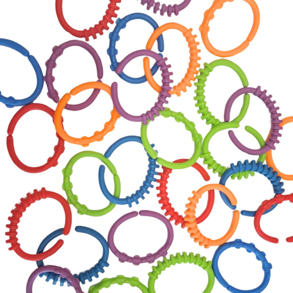 Perfectos para usar en casa, salas de juegos o jardines infantiles. Niñas y niños pueden unir los aros, separarlos, crear cadenas largas, clasificarlos por color o explorar sus texturas. Ideales para actividades sensoriales, aprendizaje temprano o simplemente para jugar libremente.