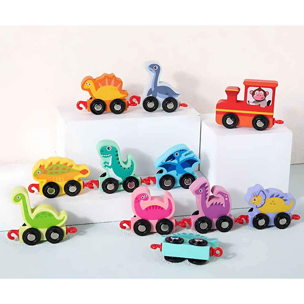 Set de 11 piezas: 1 locomotora + 10 vagones de dinosaurios numerados del 0 al 10.