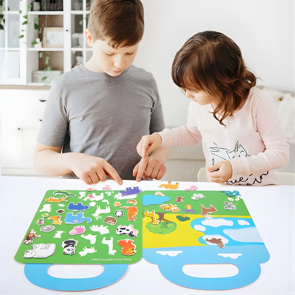 Descubran y nombren a los animales favoritos con este Libro de Stickers Magnéticos Reutilizables Animales. Incluye escenarios de pradera y granja para crear historias una y otra vez, impulsando el juego libre y la imaginación sin pantallas. Su formato tipo maletín con asa lo hace ideal para salidas, restaurantes o viajes. Es limpio, seguro y muy colorido para aprender mientras juegan.