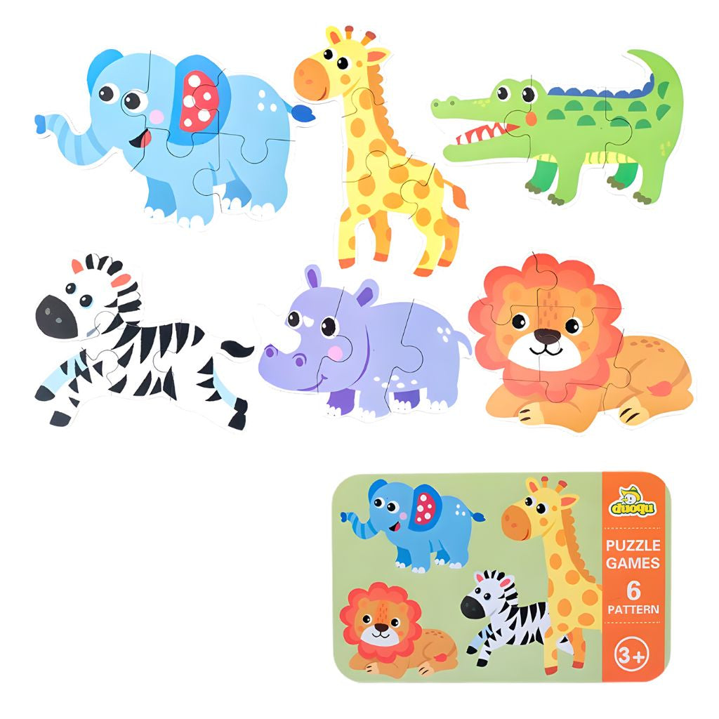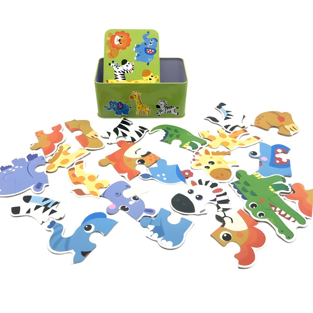 Descubre la diversión educativa con el rompecabezas animales de la selva en estuche metálico, perfectos para niños a partir de 2 años. Cada estuche incluye 6 rompecabezas con diferentes patrones, ofreciendo una variedad de desafíos que ayudarán a desarrollar la coordinación mano-ojo y las habilidades cognitivas de los pequeños.Estos rompecabezas están diseñados para capturar la imaginación de los niños mientras fomentan la concentración y la resolución de problemas.