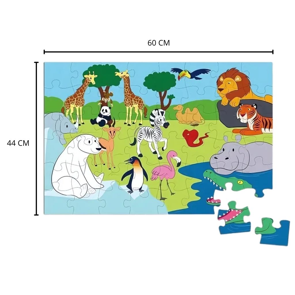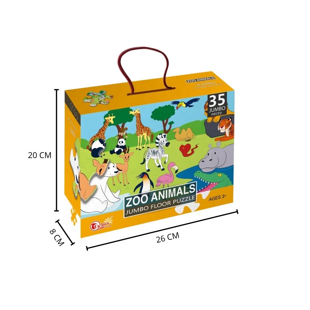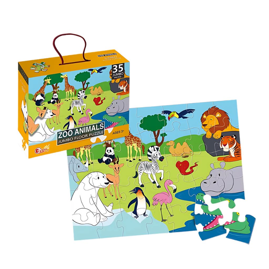 Arma una escena gigante en el piso con este rompecabezas de 35 piezas jumbo diseño Animales del Zoológico. Las piezas grandes y resistentes invitan al juego libre, fortalecen la concentración y la coordinación mano-ojo, mientras los peques descubren detalles y conversan sobre la ilustración. Ideal para armar en familia desde los 3 años. Incluye caja con asa para guardar y transportar.