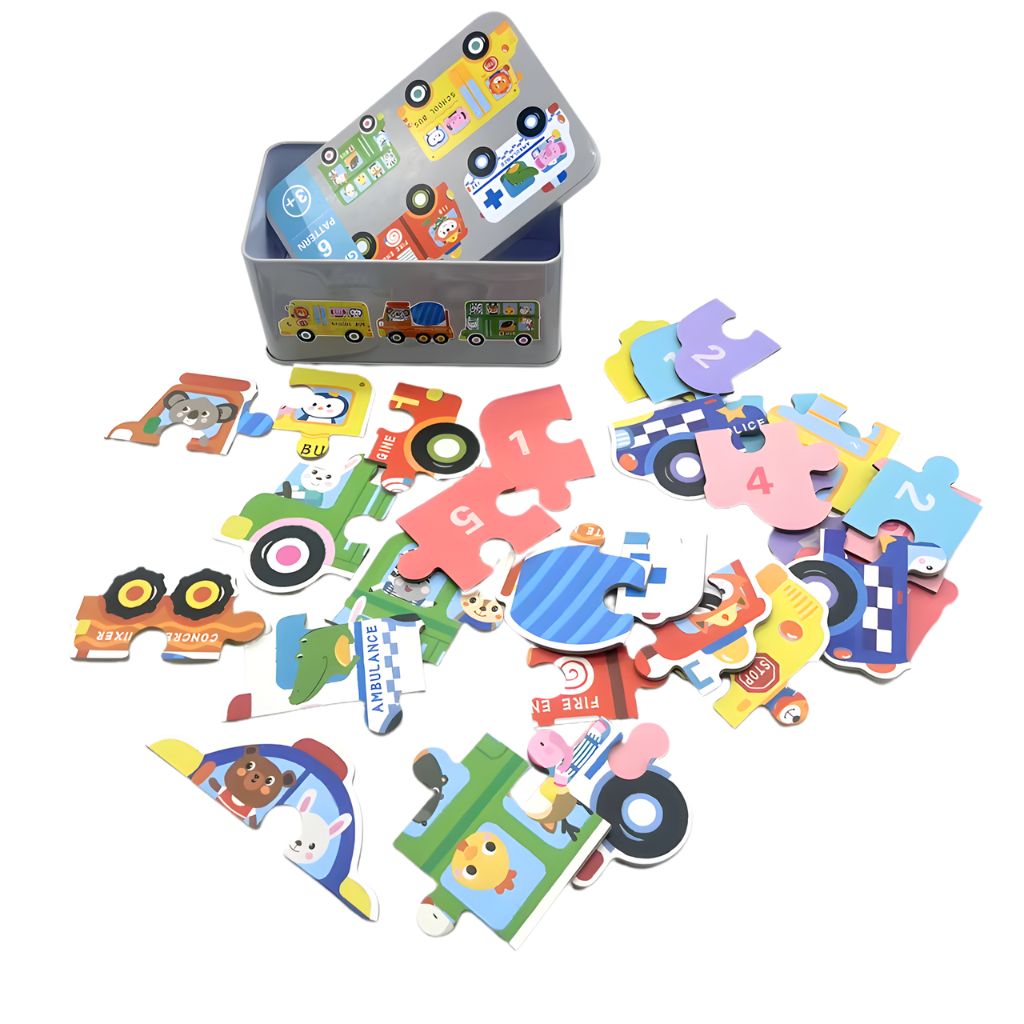 Descubre la diversión educativa con el rompecabezas vehículos de la ciudad en estuche metálico, perfectos para niños a partir de 2 años. Cada estuche incluye 6 rompecabezas con diferentes patrones, ofreciendo una variedad de desafíos que ayudarán a desarrollar la coordinación mano-ojo y las habilidades cognitivas de los pequeños.Estos rompecabezas están diseñados para capturar la imaginación de los niños mientras fomentan la concentración y la resolución de problemas.
