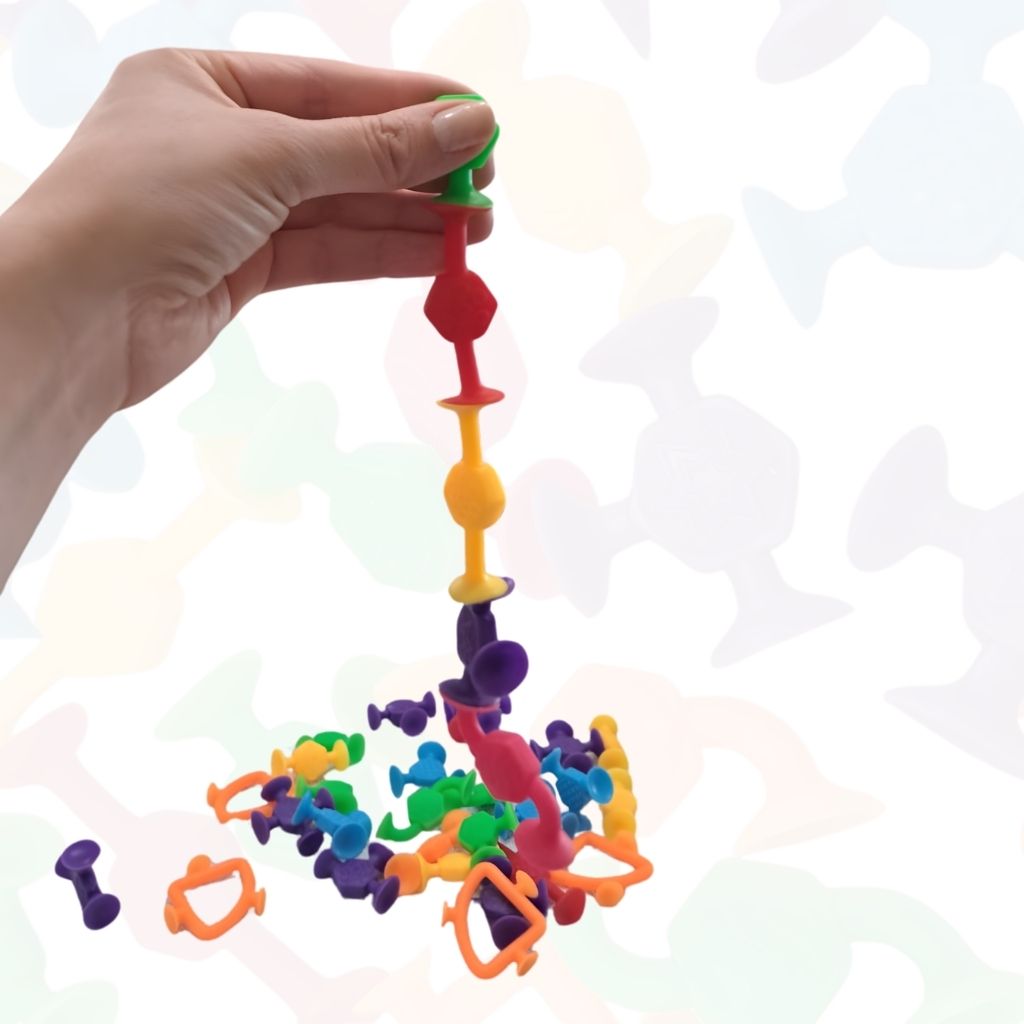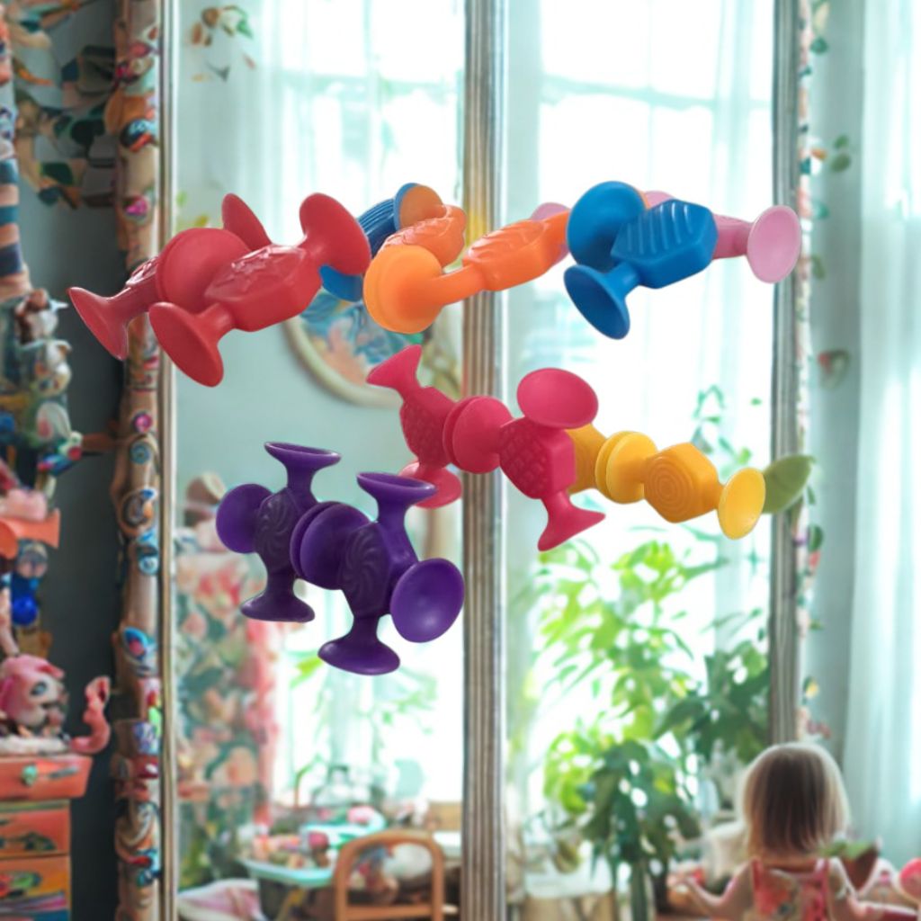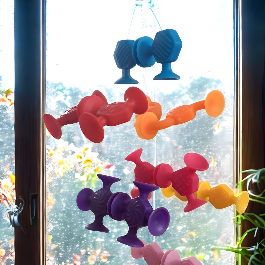 Presiona firmemente las ventosas sobre una superficie lisa y limpia, o únelas entre sí para formar cadenas, figuras y estructuras. Perfecto para juego libre en interior, ventanas y azulejos, o como actividad tranquila en restaurantes y viajes. Usar bajo supervisión adulta. Lavar antes del primer uso y cuando sea necesario.