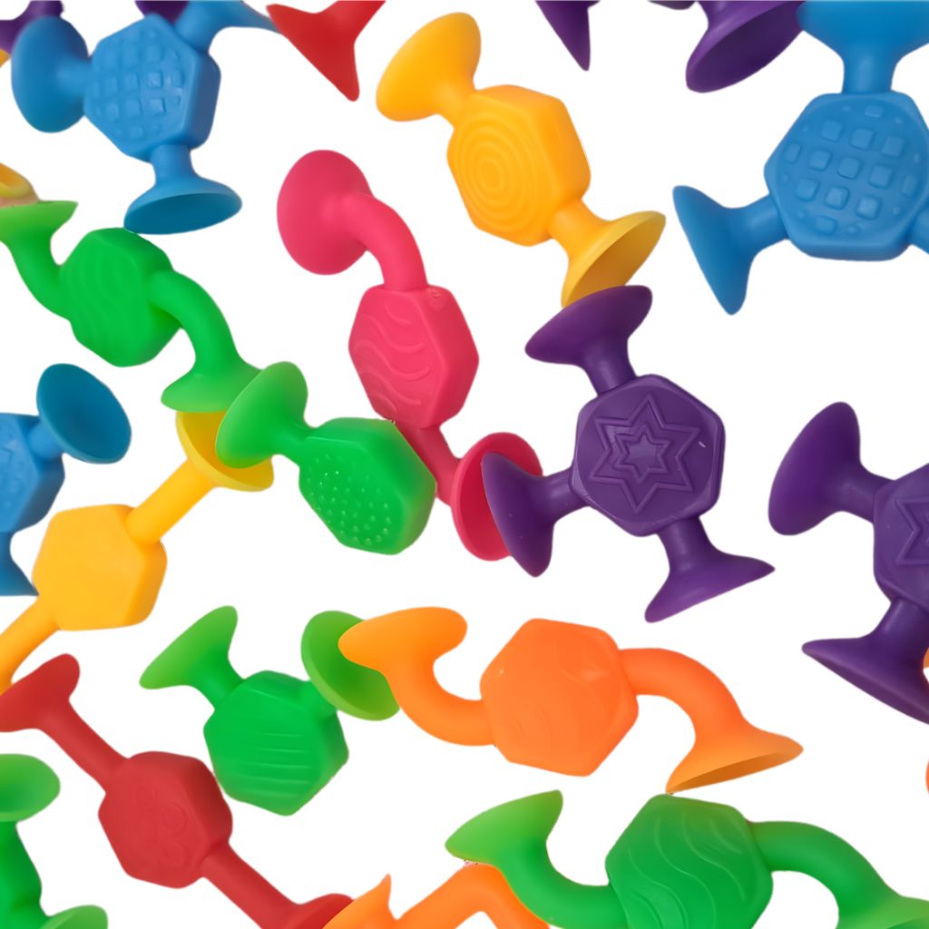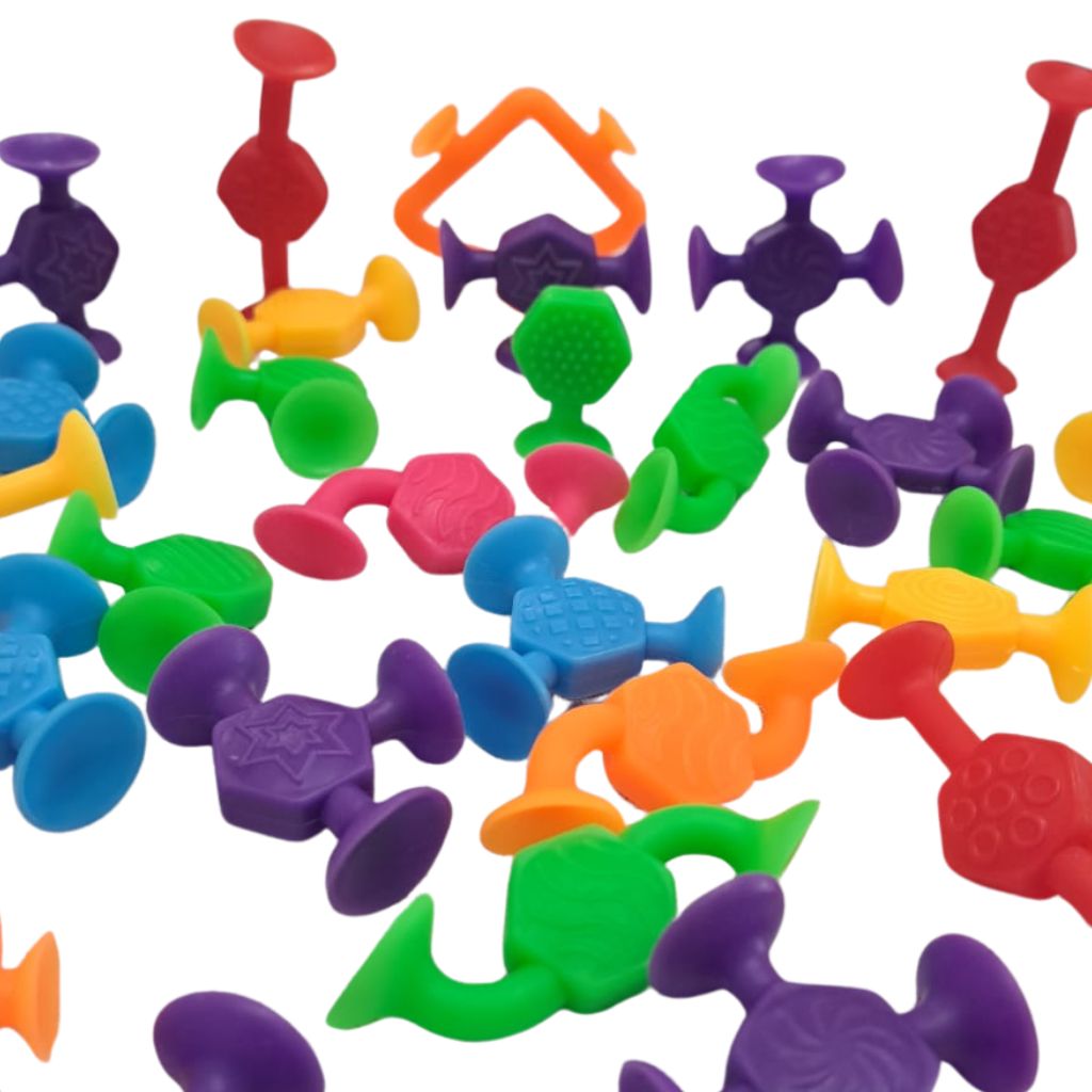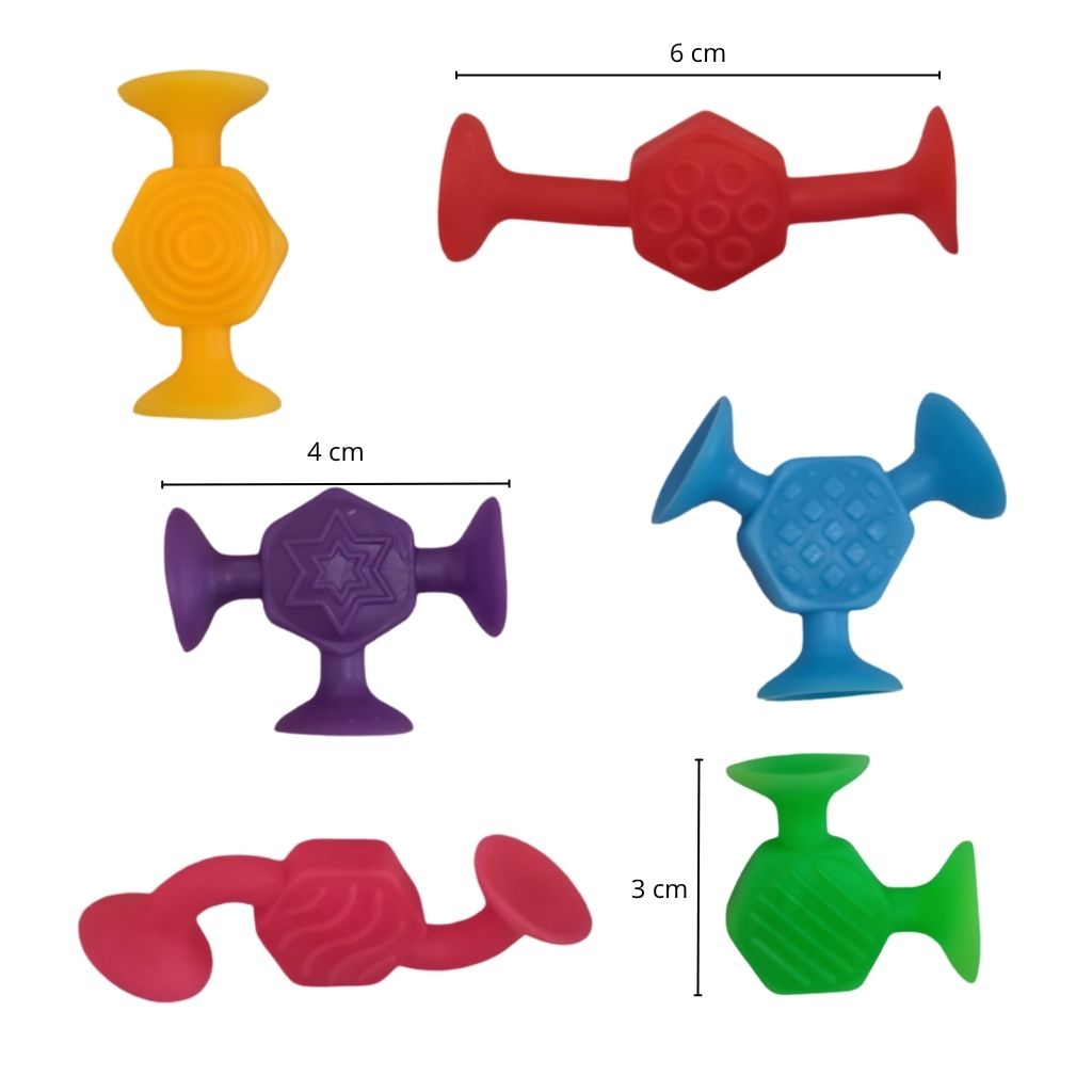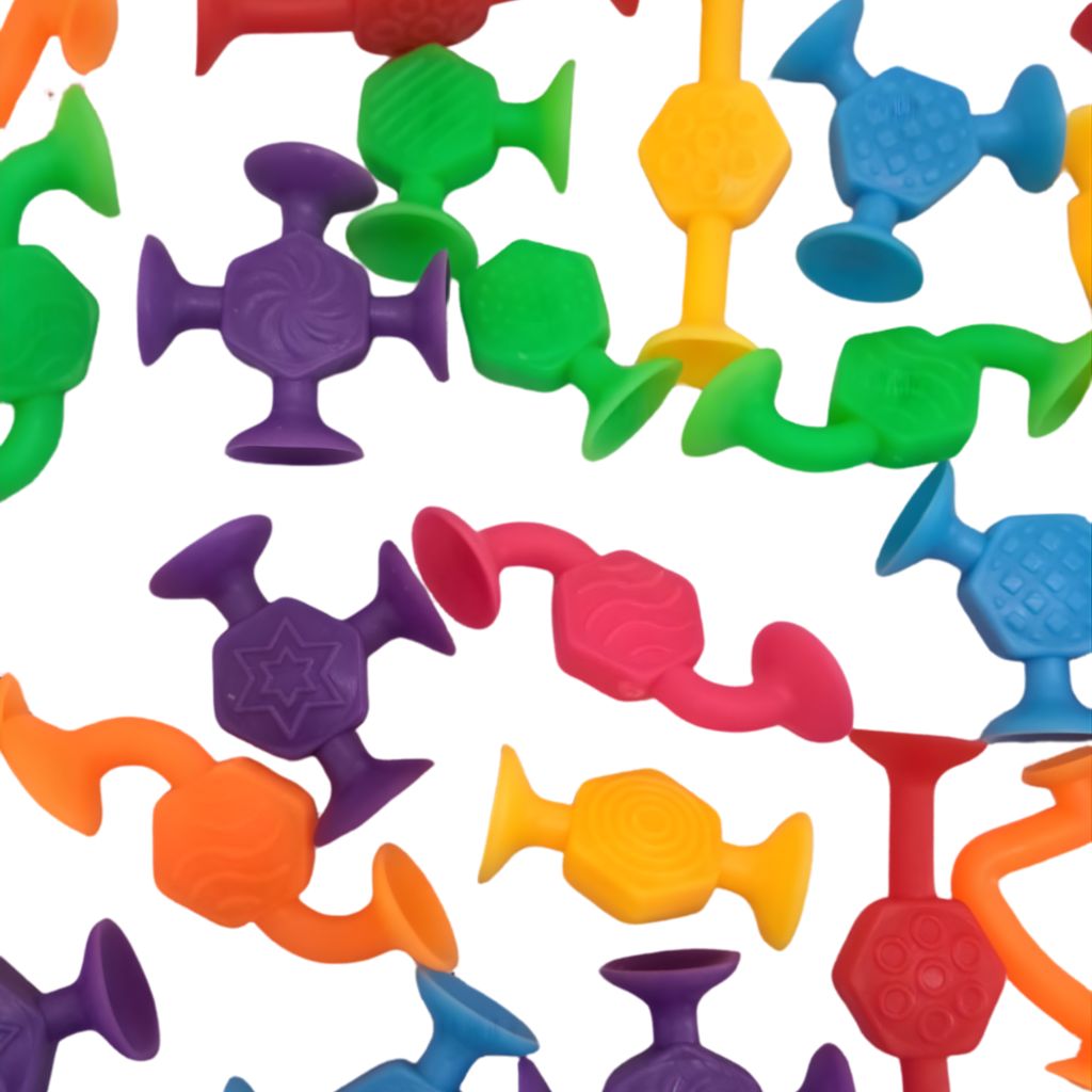 Presiona firmemente las ventosas sobre una superficie lisa y limpia, o únelas entre sí para formar cadenas, figuras y estructuras. Perfecto para juego libre en interior, ventanas y azulejos, o como actividad tranquila en restaurantes y viajes. Usar bajo supervisión adulta. Lavar antes del primer uso y cuando sea necesario.