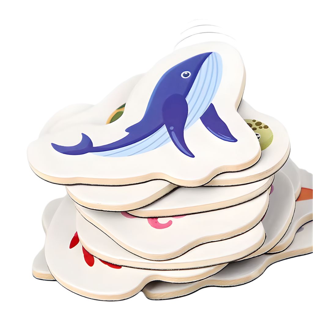Coloca el tablero sobre una mesa o el suelo e invita a buscar la silueta correcta para cada animal. Propón clasificar por tipo (mamíferos, peces, invertebrados), imitar sonidos y crear historias marinas. Ideal para juego libre en casa o actividades dirigidas en jardín infantil.